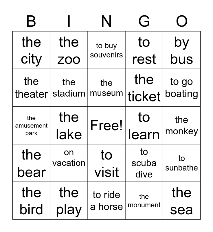 This bingo card has a free space and 24 words: on vacation, the play, the museum, the bird, by bus, the city, the theater, the zoo, to learn, to visit, the ticket, the amusement park, to scuba dive, to sunbathe, the stadium, the monument, the monkey, to buy souvenirs, to go boating, the lake, the sea, the bear, to rest and to ride a horse.