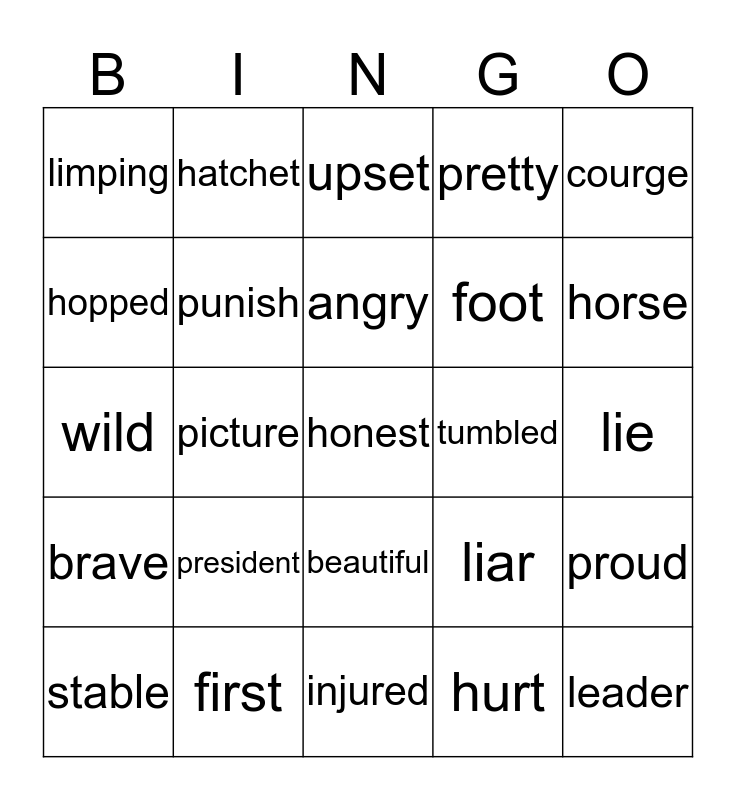 This bingo card has a free space and 24 words: president, first, angry, stable, courge, limping, hopped, hatchet, tumbled, beautiful, foot, wild, liar, proud, punish, hurt, lie, upset, horse, picture, leader, brave, pretty and injured.