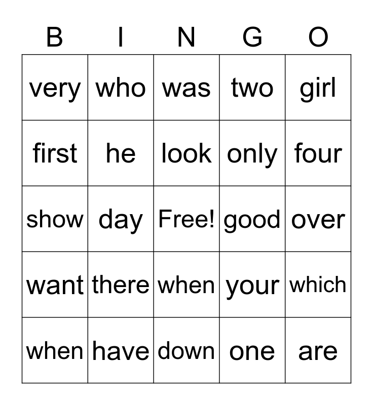This bingo card has a free space and 55 words: to, when, about, very, down, could, he, many, only, said, two, what, be, some, work, here, girl, day, new, are, good, too, your, was, for, look, one, would, over, which, were, any, she, out, first, show, two, want, before, her, who, boy, the, you, there, have, of, why, from, four, where, oh, how, when and or.