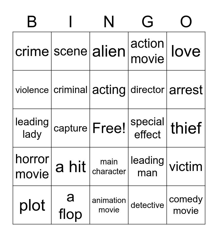 This bingo card has a free space and 24 words: a hit, a flop, acting, plot, love, crime, violence, scene, special effect, main character, director, leading lady, leading man, victim, criminal, detective, thief, alien, arrest, capture, comedy movie, horror movie, action movie and animation movie.