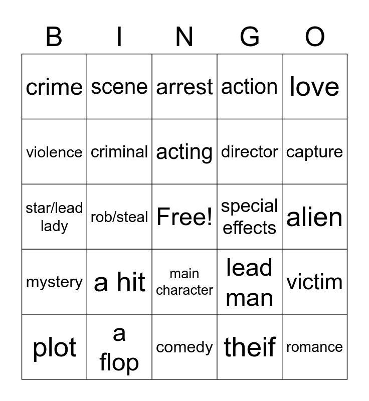 This bingo card has a free space and 24 words: a hit, a flop, acting, plot, love, crime, violence, scene, special effects, main character, director, star/lead lady, lead man, victim, criminal, theif, alien, arrest, capture, rob/steal, romance, mystery, action and comedy.
