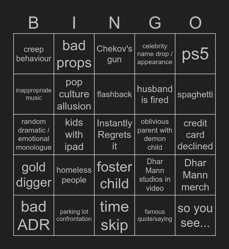 This bingo card has a free space and 51 words: Walk in on mom crying, so you see..., treat others how you want to be treated/how would you feel if that happened to you, time skip, homeless people, bad green screen, bad props, bad sound effects, inappropriate music, luxury brand name drop, pop culture allusion, celebrity name drop / appearance, Dhar Mann merch, Dhar Mann studios in video, elementary school nicknames/insults, extreme coincidence, flashback, oblivious parent with demon child, unrealistic/heavily exaggerated discrimination, ps5, kids with ipad, famous quote/saying, creep behaviour, husband is fired, secretly rich, way too on the nose names, spaghetti, someone gets evicted, bad ADR, Chekov's gun, continuity error, unreasonably calm and forgiving, antagonist has a temper, tiktok/social media, what happens in the dark will always come to light, parking lot confrontation, Porsche, sexism, child with unrealistic emotional maturity, problematic lesson, credit card declined, gold digger, Dhar Mann appearance / mention, creep behaviour, secretly used to be poor, cartoon supervillain, random dramatic / emotional monologue, Dhar Mann voiceover, nobody hears them talking really loudly, foster child and calling child failure / invalidating their aspiration.
