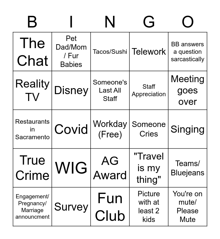 This bingo card has a free space and 24 words: WIG, Survey, Someone's Last All Staff, Engagement/ Pregnancy/ Marriage announcment, BB answers a question sarcastically, The Chat, Reality TV, Pet Dad/Mom / Fur Babies, Someone Cries, AG Award, Staff Appreciation, Restaurants in Sacramento, "Travel is my thing", Teams/ Bluejeans, Disney, Picture with at least 2 kids, Singing, Tacos/Sushi, Meeting goes over, Covid, You're on mute/ Please Mute, True Crime, Telework and Fun Club.