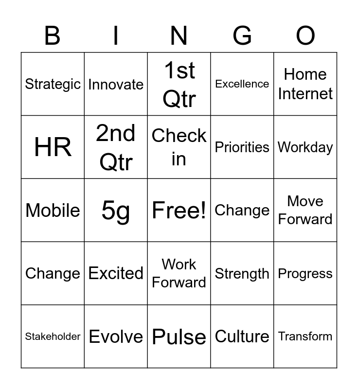 This bingo card has a free space and 29 words: Stakeholder, Together, 5g, EAP, Strategic, 1st Qtr, 2nd Qtr, Excited, Change, Evolve, Move Forward, Transform, Pulse, Culture, Workday, VTeam Central, Work Forward, Change, Home Internet, Mobile, Strength, Operational, Priorities, HR, Excellence, Innovate, Progress, Check in and Drive.