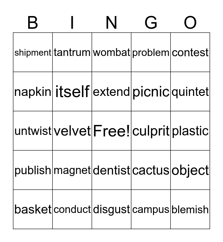 This bingo card has a free space and 24 words: magnet, conduct, extend, basket, contest, shipment, napkin, tantrum, culprit, dentist, picnic, untwist, cactus, object, itself, campus, plastic, wombat, quintet, velvet, blemish, publish, problem and disgust.