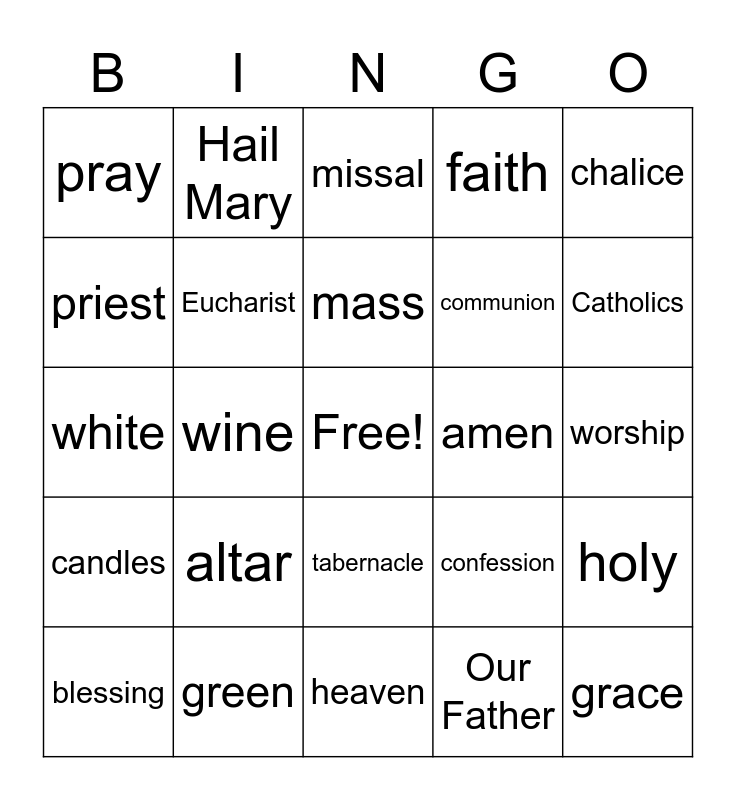 This bingo card has a free space and 37 words: Jesus, body, blood, Eucharist, holy, altar, mass, sacrament, chalice, host, wine, faith, grace, worship, priest, candles, cruets, missal, tabernacle, amen, pray, Catholics, blessing, heaven, deacon, Our Father, Hail Mary, lent, advent, purple, ordinary time, green, white, cross, confession, communion and act of contrition.