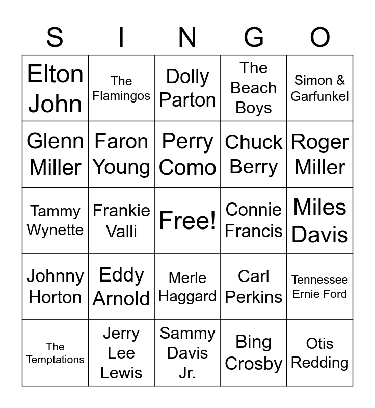 This bingo card has a free space and 109 words: Fred Astaire, Skeeter Davis, Connie Francis, Count Basie, Patti Page, Sly & The Family Stone, Barry Manilow, Kris Kristopherson, Loretta Lynn, The Chordettes, Glen Campbell, John Denver, Nat King Cole, Etta James, Tommy Dorsey, Marvin Gaye, Tammy Wynette, The Beatles, Rolling Stone, The Coasters, Tennessee Ernie Ford, Waylon Jennings, Stevie Wonder, Charlie Pride, Ricky Nelson, Perry Como, Simon & Garfunkel, Roy Orbison, Bobby Darin, Gene Autry, Roger Miller, The Beach Boys, Dolly Parton, Ritchie Valens, The Mamas & Papas, Otis Redding, Frank Sinatra, Jackson 5, Jerry Lee Lewis, Tony Bennett, Little Richard, Bobby Day, Chuck Berry, Frankie Valli, Carl Perkins, Johnny Cash, Dean Martin, Rosemary Clooney, Elvis Presley, Aretha Franklin, Lynn Anderson, Marty Robbins, Bing Crosby, Jim Reeves, The Clovers, The Platters, The Big Bopper, The Monkees, Harry Belafonte, Faron Young, Elton John, Roy Rogers, Pat Boone, Willie Nelson, The Turtles, Patsy Cline, Sonny & Cher, Bill Haley & His Comets, Fats Domino, The Shirelles, Dinah Shore, The Flamingos, Johnny Horton, The Righteous Brothers, Doris Day, Chubby Checker, Miles Davis, Lefty Frizzell, Dean Martin, Vaughn Monroe, Herman's Hermits, Judy Garland, Sam Cooke, Everly Brothers, Gogi Grant, Buddy Holly, Hank Williams, Ray Price, Glenn Miller, Hank Snow, Kenny Rogers, Eddy Arnold, The Drifters, Kitty Wells, The Isley Brothers, Johnny Mathis, Andy Williams, Paul Anka, Sammy Davis Jr., George Jones, Conway Twitty, Neil Diamond, The Temptations, Merle Haggard, Buddy Holly, Nancy Sinatra, Marilyn Monroe, James Brown and Tiny Tim.