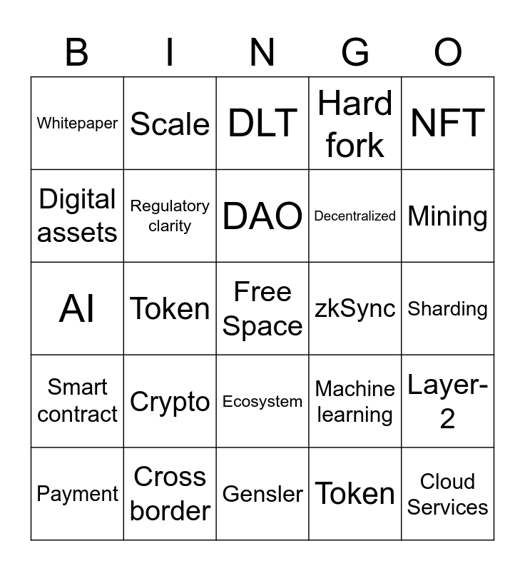 This bingo card has a free space and 24 words: Crypto, Cross border, DAO, Payment, NFT, Whitepaper, Digital assets, Scale, zkSync, Ecosystem, Decentralized, AI, Machine learning, Layer-2, Regulatory clarity, Token, Sharding, DLT, Mining, Token, Cloud Services, Smart contract, Hard fork and Gensler.