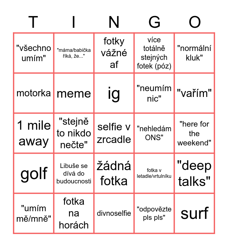 This bingo card has 50 words: výška v biu, selfie v zrcadle, flex svalů/fotka z posilovny, divnoselfie, Libuše se dívá do budoucnosti, pes/kočka, "máma/babička říká, že...", fotka v autě, motorka, "nemám premium", meme, více totálně stejných fotek (póz), "deep talks", fotka v letadle/vrtulníku, fotka "byl jsem tady", vylitý na podlaze, ig, "nehledám ONS", "Harvard", "normální kluk", "stejně to nikdo nečte", "odpovězte pls pls", "všechno umím", "neumím nic", kouří na fotce, surf, "vařím", "nepíšu první", fotky vážné af, žádná fotka, žádné bio, 1 fotka, 1 písmenné jméno, fotka s rybou, fotka na horách, "to je moje sestra", "není to moje dítě", Hodnocení od svých ex/kamarádů, emoji bio, "here for the weekend", "hledáme někoho do trojky", skupinové foto a nevíš, kdo to je, krýgl, znám ho, "umím mě/mně", 1 mile away, "pokud *něco*, swipe left", fotka bez trička, golf and pochybná univerzita.