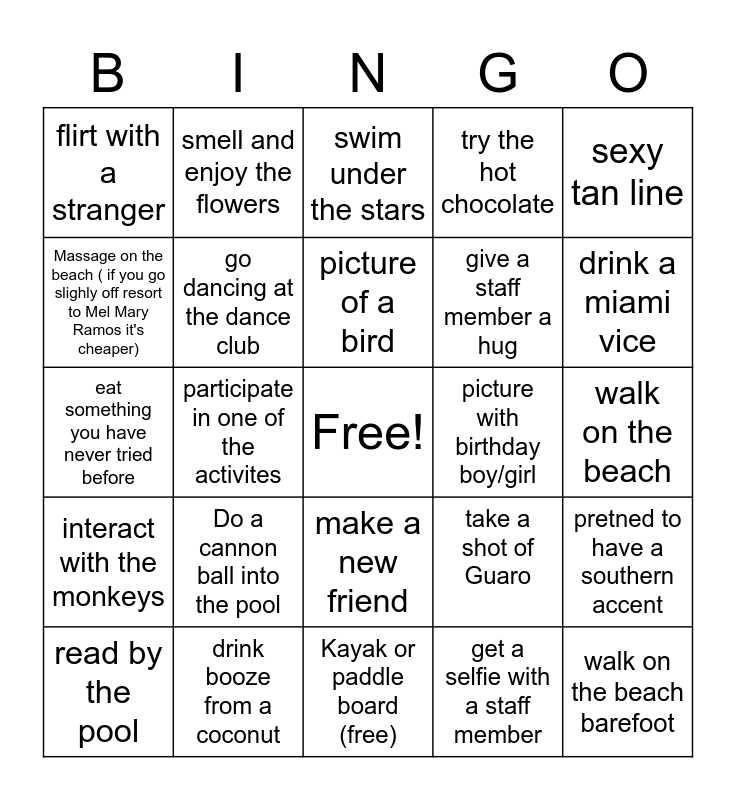 This bingo card has a free space and 24 words: Do a cannon ball into the pool, drink booze from a coconut, picture of a bird, read by the pool, sexy tan line, flirt with a stranger, Massage on the beach ( if you go slighly off resort to Mel Mary Ramos it's cheaper), smell and enjoy the flowers, picture with birthday boy/girl, make a new friend, give a staff member a hug, eat something you have never tried before, take a shot of Guaro, pretned to have a southern accent, go dancing at the dance club, get a selfie with a staff member, walk on the beach, swim under the stars, drink a miami vice, participate in one of the activites, walk on the beach barefoot, interact with the monkeys, try the hot chocolate and Kayak or paddle board (free).
