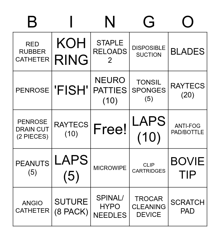 This bingo card has a free space and 24 words: LAPS (5), SUTURE (8 PACK), NEURO PATTIES (10), ANGIO CATHETER, BLADES, RED RUBBER CATHETER, PENROSE, KOH RING, LAPS (10), MICROWIPE, TONSIL SPONGES (5), PENROSE DRAIN CUT (2 PIECES), CLIP CARTRIDGES, BOVIE TIP, 'FISH', TROCAR CLEANING DEVICE, ANTI-FOG PAD/BOTTLE, STAPLE RELOADS 2, RAYTECS (20), RAYTECS (10), SCRATCH PAD, PEANUTS (5), DISPOSIBLE SUCTION and SPINAL/ HYPO NEEDLES.