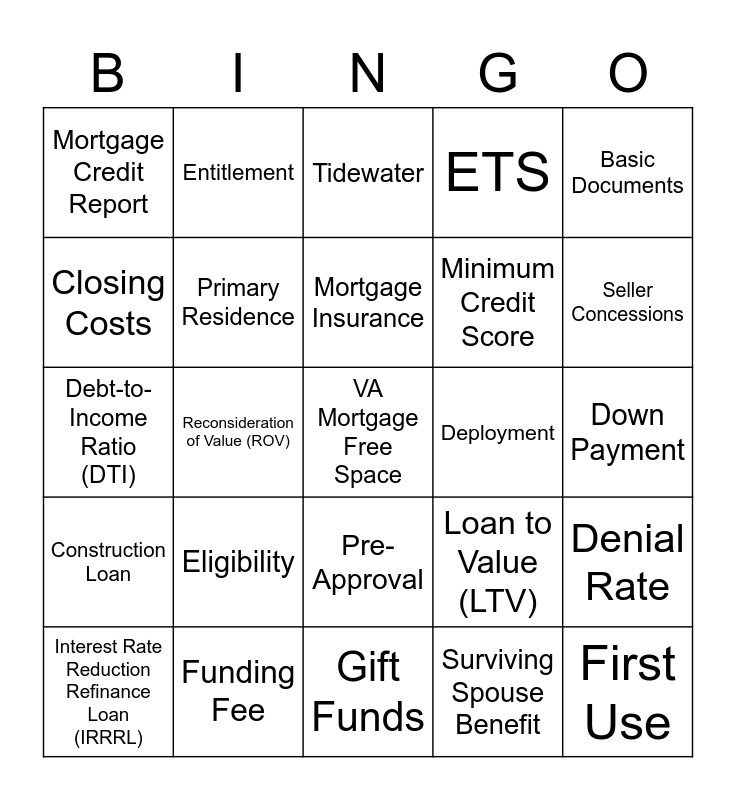 This bingo card has a free space and 24 words: Eligibility, Funding Fee, Mortgage Insurance, Interest Rate Reduction Refinance Loan (IRRRL), Basic Documents, Mortgage Credit Report, Closing Costs, Entitlement, Deployment, Pre-Approval, Minimum Credit Score, Debt-to-Income Ratio (DTI), Loan to Value (LTV), Denial Rate, Primary Residence, Surviving Spouse Benefit, Down Payment, Tidewater, Seller Concessions, Reconsideration of Value (ROV), First Use, Construction Loan, ETS and Gift Funds.
