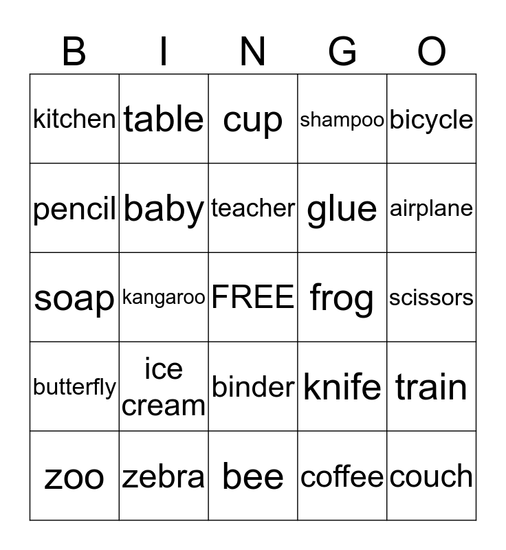 This bingo card has a free space and 24 words: ice cream, zebra, teacher, zoo, bicycle, kitchen, pencil, table, frog, binder, glue, soap, knife, train, baby, coffee, scissors, cup, airplane, kangaroo, couch, butterfly, shampoo and bee.