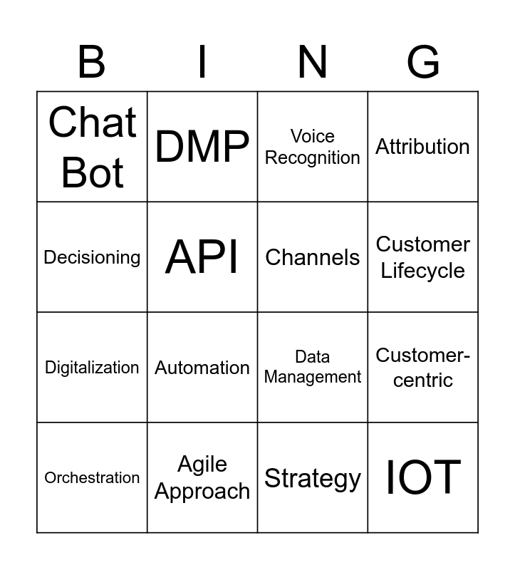 This bingo card has 68 words: Customer Data Platform, Orchestration, Artificial Intelligence, Machine Learning, Generative AI, Chat GPT, DMP, Data Lake, Customer Lifecycle, Customer Journey, Cloud, Content, Strategy, Decisioning, Integrated, API, Customer-centric, Chat Bot, Agent, Mobile First, Digitalization, Personalization, IOT, Block chain, GDPR, PII, Optimization, Customer Journey Optimization, Algorithm, Natural Language Processing, Voice Recognition, Location Based Analytics, Net Promoter Score, Churn, Attribution, Customer Experience, Loyalty, Customer Experience Management, Automation, Data Management, Streaming Data, Customer Lifetime Value, Channels, Omni-channel, Multi-channel, Retention, Revolutionize, 360 Degree View, Agile Approach, Real-time, Campaign Management, Marketing Mix, Contact Policy, People, process, technology, Change Management, Cross-sell, Up-sell, Deep Learning, Attribution, MadTech, Phygital, Hybrid Data architecture, Cloud Data Warehouse, Data Silos, Video Sreaming, Connected TV, Audience and Segment.