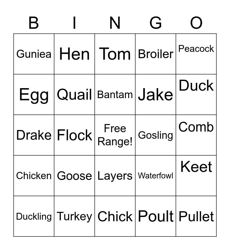 This bingo card has a free space and 25 words: Chicken, Turkey, Chick, Poult, Peacock, Guniea, Hen, Tom, Gosling, Keet, Egg, Quail, Pheasant, Waterfowl, Duck, Duckling, Flock, Bantam, Jake, Comb, Drake, Goose, Layers, Broiler and Pullet.