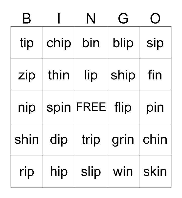 This bingo card has a free space and 24 words: dip, hip, lip, rip, sip, tip, zip, chip, flip, trip, ship, nip, grin, chin, thin, win, pin, bin, fin, spin, skin, shin, blip and slip.