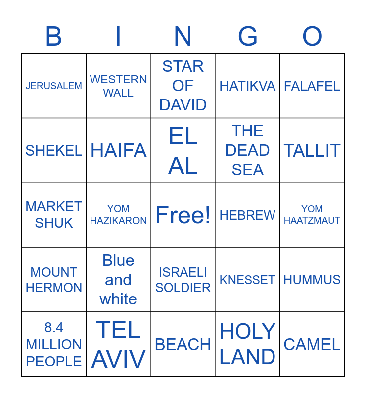 This bingo card has a free space and 24 words: Blue and white, TEL AVIV, EL AL, 8.4 MILLION PEOPLE, FALAFEL, JERUSALEM, SHEKEL, WESTERN WALL, HEBREW, ISRAELI SOLDIER, THE DEAD SEA, MARKET SHUK, KNESSET, HUMMUS, HAIFA, HOLY LAND, YOM HAATZMAUT, STAR OF DAVID, TALLIT, YOM HAZIKARON, CAMEL, MOUNT HERMON, HATIKVA and BEACH.