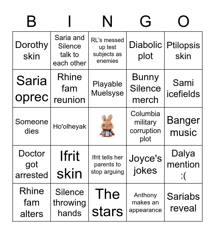 This bingo card has a free space and 24 words: Rhine fam alters, Ifrit skin, Playable Muelsyse, Anthony makes an appearance, Ptilopsis skin, Dorothy skin, Saria and Silence talk to each other, RL's messed up test subjects as enemies, Columbia military corruption plot, Banger music, Someone dies, Rhine fam reunion, Joyce's jokes, Dalya mention :(, Saria oprec, Silence throwing hands, The stars, Diabolic plot, Sami icefields, Doctor got arrested, Ho'olheyak, Ifrit tells her parents to stop arguing, Bunny Silence merch and Sariabs reveal.