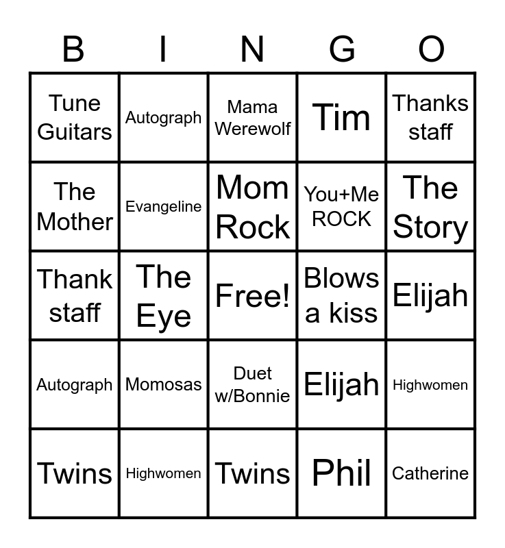 This bingo card has a free space and 47 words: You+Me ROCK, Catherine, The Story, Twins, Momosas, Duet w/Bonnie, Autograph, Carried me…, The Mother, BONFIRE, Evangeline, Tim, Highwomen, Elijah, A Cover, Broken Horses, Mom Rock, Blows a kiss, Mama Werewolf, Thanks staff, The Eye, Phil, Tune Guitars, You+Me ROCK, Catherine, The Story, Twins, Momosas, Duet w/Bonnie, Autograph, Carried me…, The Mother, BONFIRE, Evangeline, Tim, Highwomen, Elijah, A Cover, Broken Horses, Mom Rock, Blows a kiss, Mama Werewolf, Thank staff, The Eye, Phil, Tune Guitars and Tells Joke.