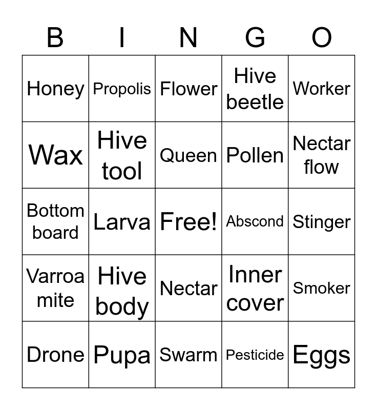 This bingo card has a free space and 25 words: Hive body, Swarm, Queen, Drone, Worker, Honey, Wax, Propolis, Abscond, Nectar, Pollen, Bottom board, Inner cover, Smoker, Hive tool, Veil, Stinger, Flower, Nectar flow, Larva, Eggs, Pupa, Varroa mite, Hive beetle and Pesticide.