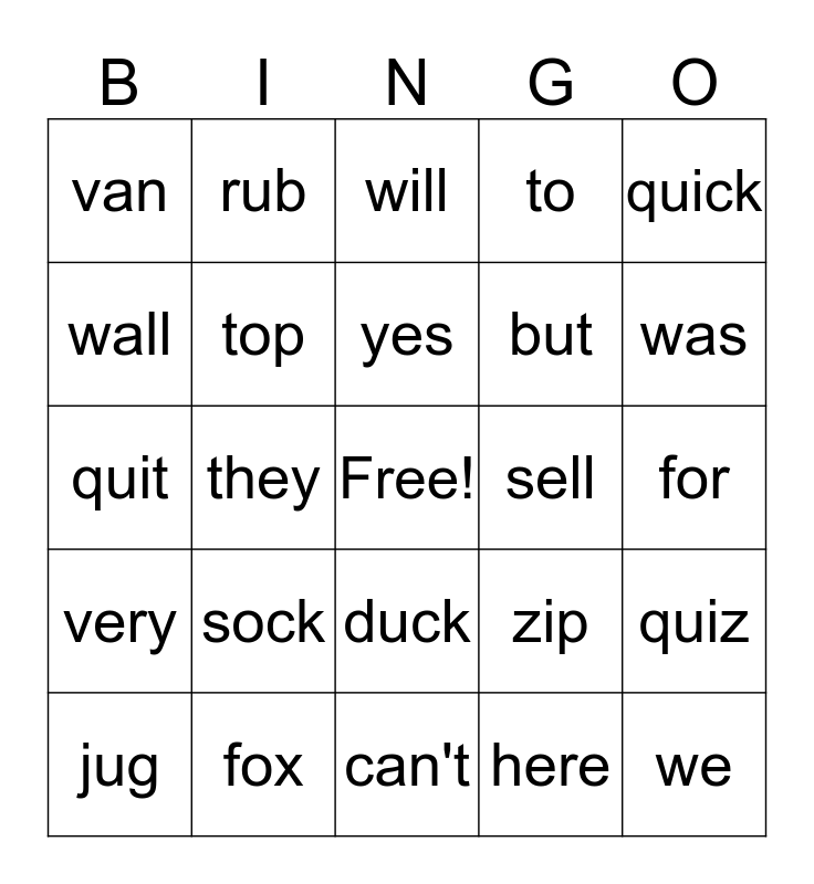 This bingo card has a free space and 24 words: sock, fox, yes, jug, quick, van, wall, rub, sell, duck, but, quit, zip, quiz, top, here, for, will, was, they, we, very, to and can't.