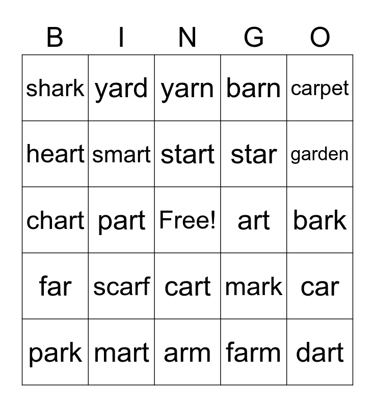 This bingo card has a free space and 28 words: car, jar, star, farm, heart, yarn, yard, far, art, park, chart, barn, mart, arm, garden, harp, scarf, smart, start, cart, shark, scar, dart, part, bark, mark, carpet and marble.