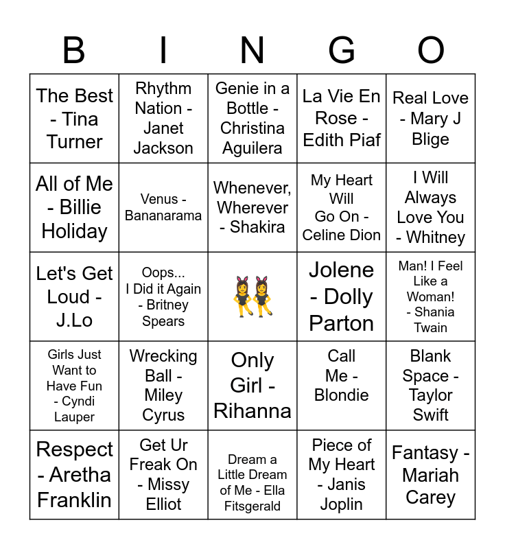 This bingo card has a free space and 36 words: Run the World - Beyonce, Ironic - Alanis Morissette, Valerie - Amy Winehouse, Venus - Bananarama, Call Me - Blondie, Girls Just Want to Have Fun - Cyndi Lauper, Whenever, Wherever - Shakira, Poker Face - Lady Gaga, Real Love - Mary J Blige, Believe - Cher, Oops... I Did it Again - Britney Spears, La Vie En Rose - Edith Piaf, Material Girl - Madonna, Jolene - Dolly Parton, I Will Always Love You - Whitney, The Best - Tina Turner, Leather + Lace - Stevie Nicks, Wrecking Ball - Miley Cyrus, Fantasy - Mariah Carey, Genie in a Bottle - Christina Aguilera, Man! I Feel Like a Woman! - Shania Twain, Blank Space - Taylor Swift, Get Ur Freak On - Missy Elliot, Respect - Aretha Franklin, Dream a Little Dream of Me - Ella Fitsgerald, Rhythm Nation - Janet Jackson, Let's Get Loud - J.Lo, You Don't Bring Me Flowers - Barbra Streisand, My Heart Will Go On - Celine Dion, All of Me - Billie Holiday, I'm Coming Out - Diana Ross, Turn The Beat Around - Gloria Estefan, Piece of My Heart - Janis Joplin, Only Girl - Rihanna, Fancy - Reba McEntire and We Got The Beet - The Go-Gos.