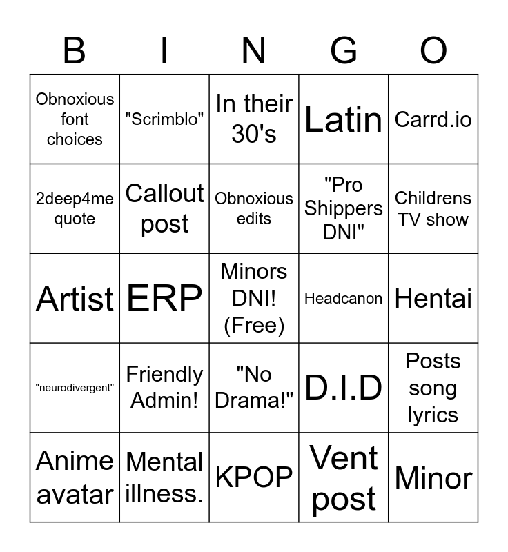 This bingo card has a free space and 24 words: Friendly Admin!, Mental illness., Obnoxious edits, Anime avatar, Carrd.io, Obnoxious font choices, 2deep4me quote, "Scrimblo", Headcanon, "No Drama!", "Pro Shippers DNI", Artist, D.I.D, Posts song lyrics, Callout post, Vent post, Hentai, In their 30's, Childrens TV show, ERP, Minor, "neurodivergent", Latin and KPOP.