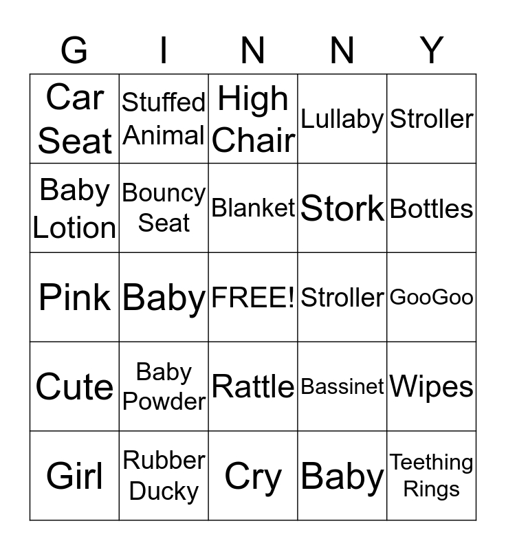 This bingo card has a free space and 30 words: Rubber Ducky, GaGa, Baby, Diaper, Car Seat, High Chair, Bouncy Seat, Rattle, Stroller, Cry, GooGoo, Teething Rings, Baby, Toys, Bottles, Crib, Bassinet, Cute, Baby Powder, Stroller, Pink, Sleep, Stuffed Animal, Stork, Baby Lotion, Lullaby, Wipes, Girl, Blanket and Pacifier.