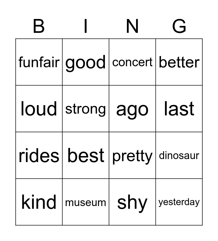 This bingo card has 16 words: museum, dinosaur, concert, funfair, rides, good, pretty, shy, loud, strong, kind, better, best, last, ago and yesterday.