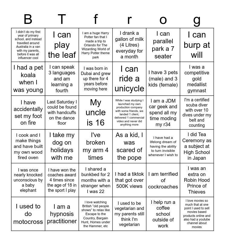 This bingo card has 36 words: I had a tiktok that got over 500K views, I shared a bunkbed for 2 months with a stranger when I was 22, I used to be vegetarian and my parents still think I'm vegetarian, I had a pet koala when I was young, I cook and I make things and have built my own wood fired oven, While I was studying I launched my own production company with some friends, we landed 1 client, delivered 1 commercial video and never did anything more, I can speak 3 languages and am learning a fourth, I love watching British “old people shows” to relax like Escape to the Country, Bargain Hunt, Homes under the Hammer, etc, I can parallel park a 7 seater, I am terrified of cockroaches, I was a competitive gold medallist gymnast, I drank a gallon of milk (4 Litres) everyday for a month, I was an extra on Robin Hood Prince of Thieves, Last Saturday I could be found with handcuffs on the dance floor, I can ride a unicycle, I didn’t do my first year of primary school, and instead travelled around Australia in a van with my parents, before it was all influencer cool, I was once nearly knocked unconscious by a baby elephant, I am a JDM car geek and spend all my time moding my r34, I have accidentally set my foot on fire, I am a huge Harry Potter fan that I made a trip to Orlando for The Wizarding World of Harry Potter theme park, My uncle is 16, I take my dog on holidays with me, As a kid, I was scared of the pope, I've broken my arm 4 times, I have had a lifelong dream of having the ability to turn invisible whenever I wish to, I can play the leaf, I have 3 pets (male) and 3 kids (female), I am a hypnosis practitioner, I was born in Dubai and grew up there for 4 years before moving here, I can burp at will, I love movies so much that at one point I used to sell movies based products online and also had a youtube channel about movies, I used to do motocross, I did Tea Ceremony as a subject at High School in Japan, I'm a certified scuba diver with over 10 dives under my belt and counting, I have won the coaches award 4 times since the age of 18 in the sport I play and I help run a coffee school outside of work.