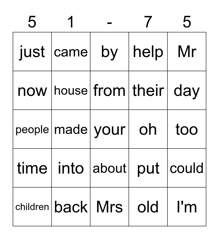 This bingo card has a free space and 24 words: into, back, from, children, Mr, just, now, came, oh, about, their, people, put, could, house, old, too, by, day, made, I'm, time, help and Mrs.