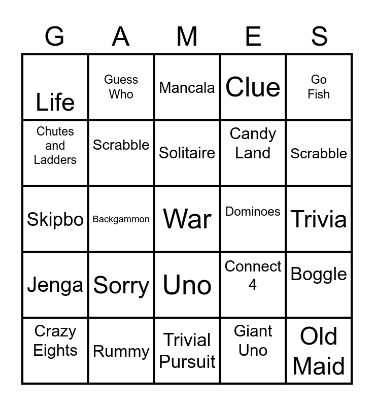 This bingo card has a free space and 24 words: Sorry, Rummy, Solitaire, Crazy Eights, Go Fish, Life, Chutes and Ladders, Guess Who, Dominoes, Uno, Candy Land, Skipbo, Connect 4, Boggle, Scrabble, Giant Uno, Trivia, Mancala, Scrabble, Backgammon, Old Maid, Jenga, Clue and Trivial Pursuit.
