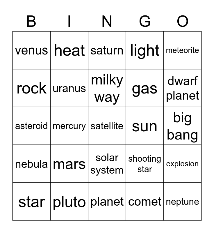 This bingo card has a free space and 29 words: star, earth, mercury, jupiter, venus, saturn, uranus, mars, sun, pluto, big bang, neptune, planet, comet, dwarf planet, galaxy, solar system, nebula, meteorite, asteroid, shooting star, moon, gas, rock, light, heat, explosion, milky way and space.