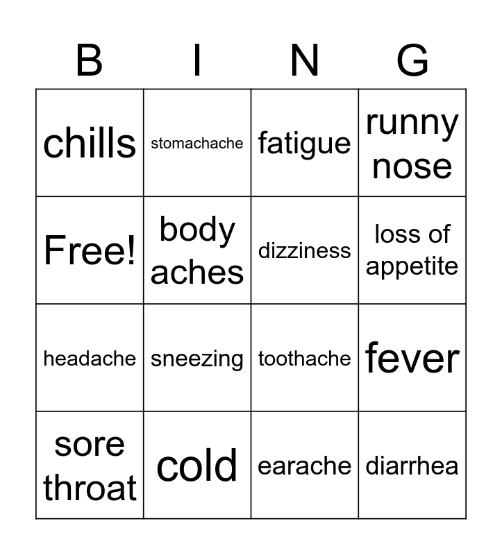 This bingo card has 16 words: cold, fever, fatigue, chills, headache, stomachache, toothache, earache, Free!, body aches, sore throat, runny nose, sneezing, loss of appetite, dizziness and diarrhea.