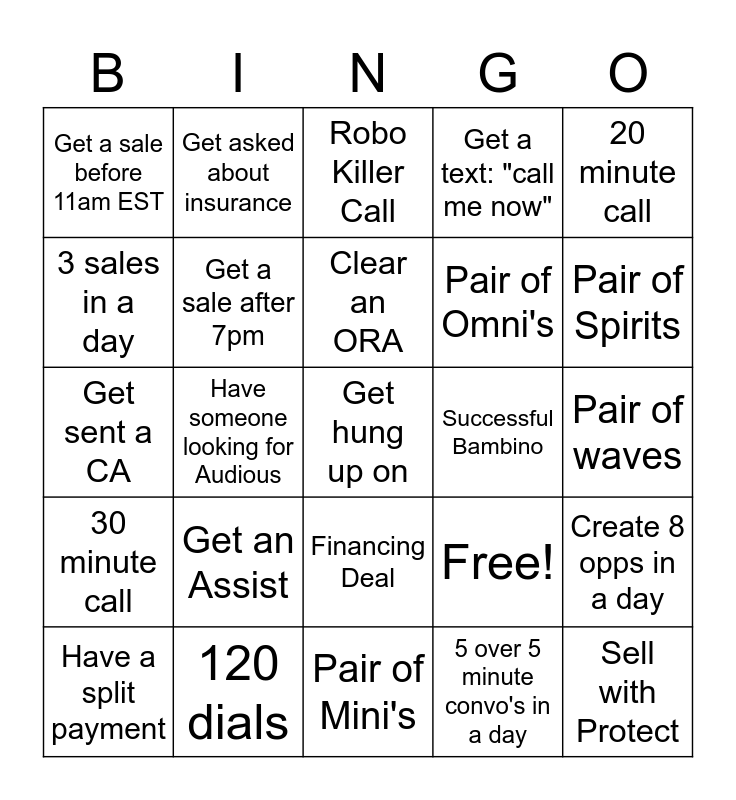 This bingo card has 25 words: Get an Assist, Pair of Mini's, Clear an ORA, Have a split payment, 20 minute call, Get a sale before 11am EST, 3 sales in a day, Get asked about insurance, Successful Bambino, Financing Deal, Pair of Omni's, Get sent a CA, Free!, Create 8 opps in a day, Get a sale after 7pm, Sell with Protect, Pair of waves, Robo Killer Call, Pair of Spirits, Have someone looking for Audious, Get hung up on, 120 dials, 30 minute call, Get a text: "call me now" and 5 over 5 minute convo's in a day.