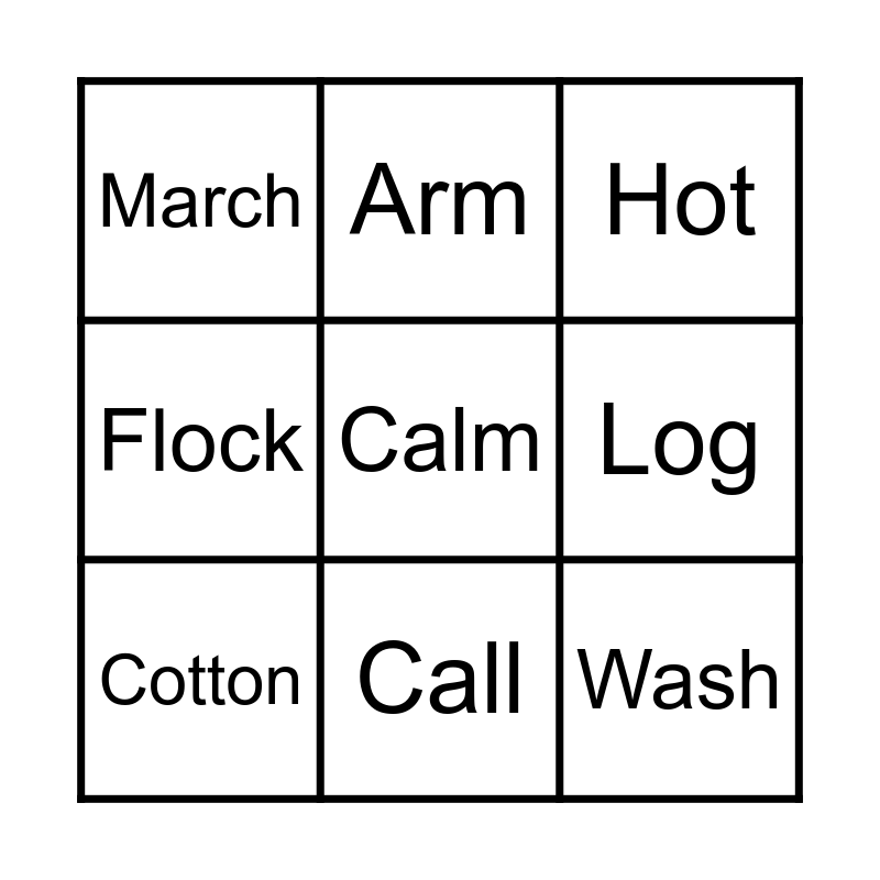 This bingo card has 49 words: Bottle, Box, Arch, On, Chop, Clock, Arm, Watch, Log, Honest, Cotton, Flock, Oxen, Cop, Option, Block, Call, Odd, Artist, Calm, Are, Alarm, March, Wash, Top, Father, Start, Crop, Cot, Pardon, Dark, Dock, Wallet, Drop, Doll, Got, Pocket, Flop, Rocket, Stop, Lock, Job, Knock, Shop, Wasp, Hot, Farm, Far and Want.
