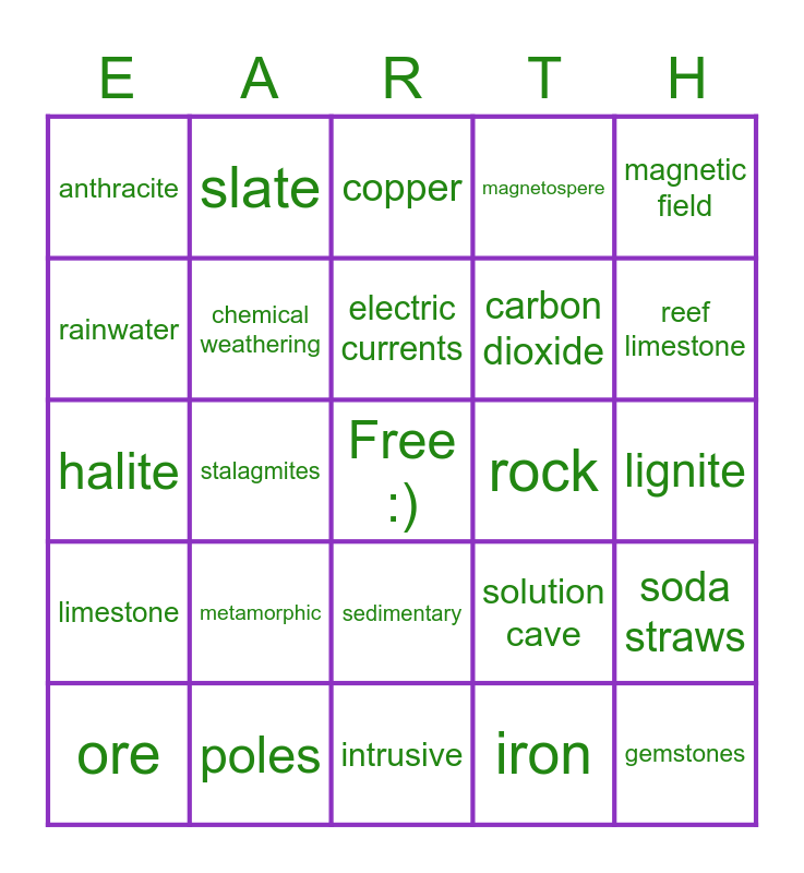 This bingo card has a free space and 43 words: diamond, gemstones, cave, ore, precious stones, iron, copper, fossil, magnetic field, poles, magnetospere, rock, sedimentary, metamorphic, extrusive, intrusive, granite, halite, sandstone, reef limestone, slate, marble, foliated, anthracite, bituminous, lignite, troglophile, speleology, solution cave, limestone, trogloxene, soda straws, cave pearls, stalagmites, columns, stalactites, outer core, electric currents, rainwater, carbon dioxide, mild acid, chemical weathering and igneous.