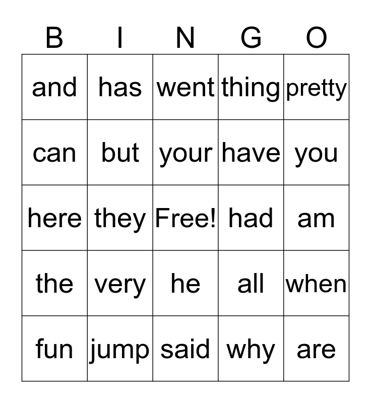 This bingo card has a free space and 24 words: very, jump, your, fun, pretty, and, can, has, had, he, have, here, all, when, but, why, am, went, you, they, are, the, thing and said.