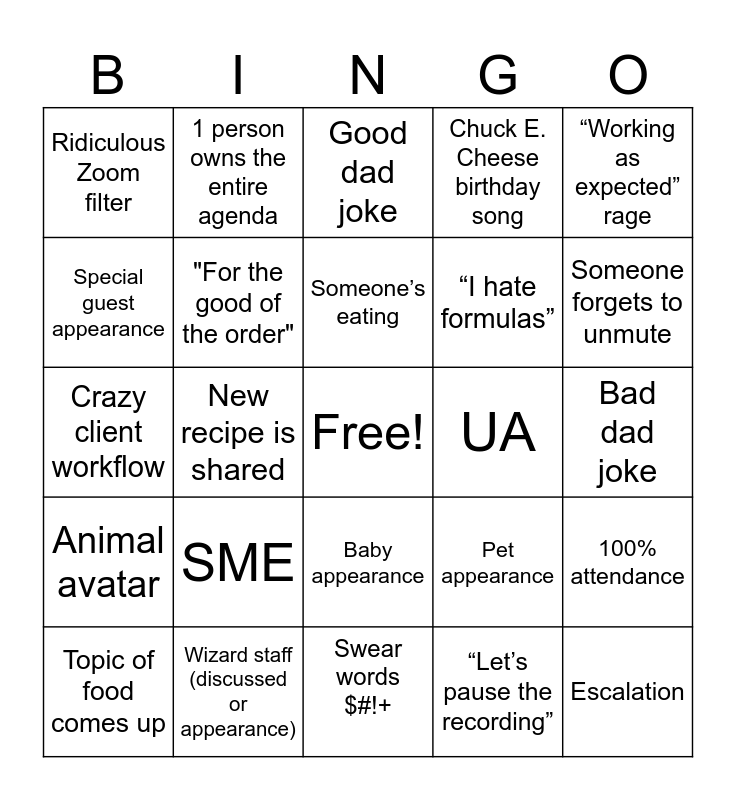 This bingo card has a free space and 26 words: Baby appearance, “Let’s pause the recording”, Someone’s eating, Wizard staff (discussed or appearance), “Working as expected” rage, Ridiculous Zoom filter, Special guest appearance, 1 person owns the entire agenda, Bad dad joke, Pet appearance, “I hate formulas”, Crazy client workflow, 100% attendance, Topic of food comes up, New recipe is shared, “Seamless integration”, Chuck E. Cheese birthday song, Animal avatar, Good dad joke, Escalation, Someone forgets to unmute, Swear words $#!+, UA, SME, "For the good of the order" and someone has a sick kiddo.