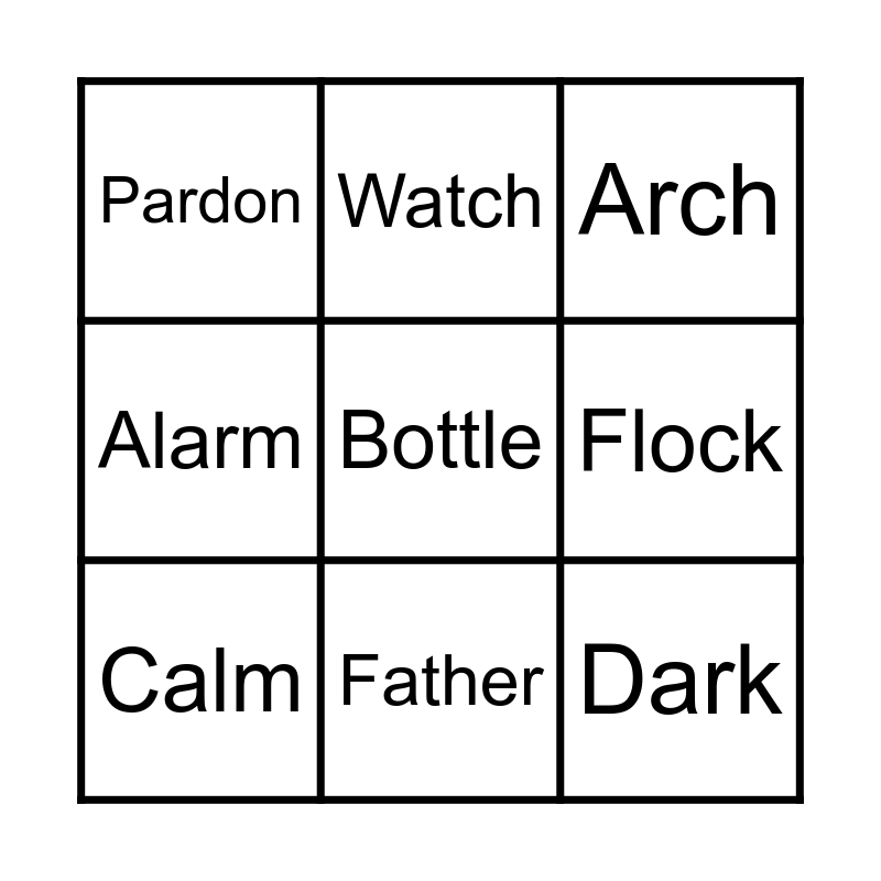 This bingo card has 49 words: Chop, Arm, Clock, Are, Cotton, Oxen, Watch, On, Flock, Log, Calm, Alarm, Knock, March, Wallet, Box, Father, Start, Top, Bottle, Crop, Cot, Pardon, Dark, Got, Pocket, Drop, Farm, Dock, Flop, Honest, Stop, Job, Option, Block, Call, Odd, Hot, Artist, Rocket, Doll, Lock, Far, Want, Wash, Arch, Cop, Shop and Wasp.