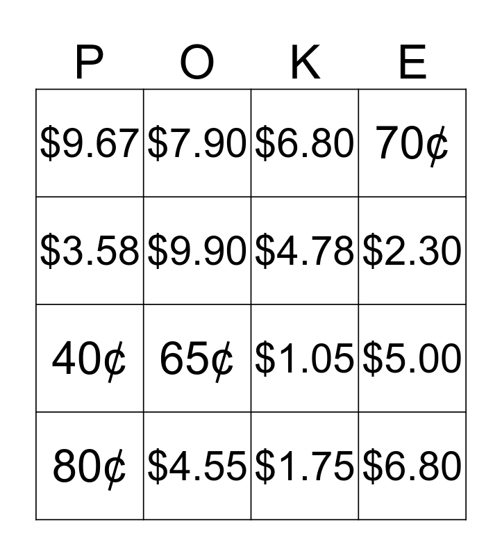 This bingo card has a free space and 15 words: 80¢, $6.80, $6.80, $9.67, $2.30, $3.58, 65¢, $1.75, $9.90, 40¢, $5.00, 70¢, $4.78, $7.90 and $4.55.