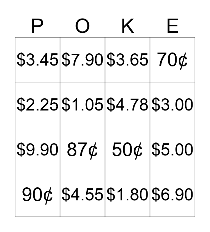 This bingo card has a free space and 15 words: 90¢, $6.90, $3.65, $3.45, $3.00, $2.25, 87¢, $1.80, $1.05, $9.90, $5.00, 70¢, $4.78, $7.90 and $4.55.