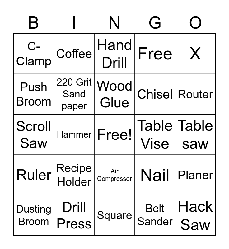 This bingo card has a free space and 24 words: Recipe Holder, Drill Press, Wood Glue, Dusting Broom, X, C-Clamp, Push Broom, Coffee, Table Vise, Air Compressor, Chisel, Scroll Saw, Nail, Planer, 220 Grit Sand paper, Belt Sander, Table saw, Hand Drill, Router, Hammer, Hack Saw, Ruler, Free and Square.