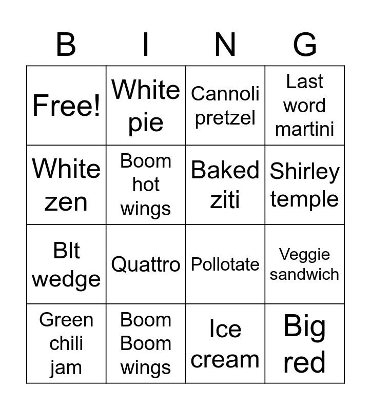 This bingo card has 16 words: Green chili jam, Boom Boom wings, Cannoli pretzel, Last word martini, White zen, White pie, Pollotate, Veggie sandwich, Free!, Boom hot wings, Ice cream, Shirley temple, Blt wedge, Quattro, Baked ziti and Big red.