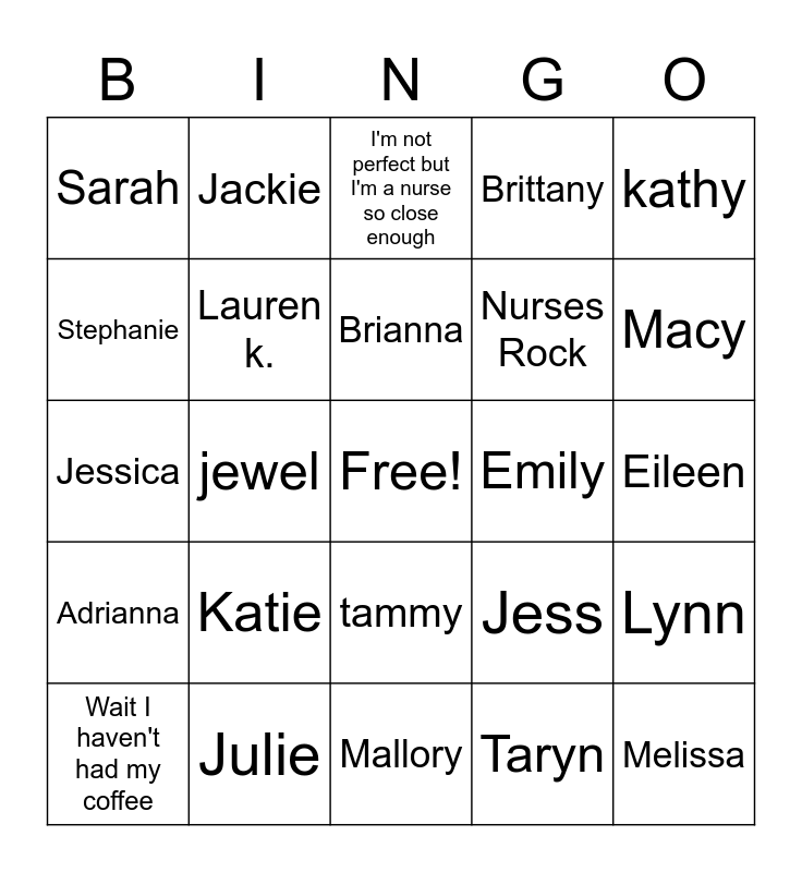 This bingo card has a free space and 24 words: Wait I haven't had my coffee, Katie, Brianna, Taryn, kathy, Sarah, Jackie, I'm not perfect but I'm a nurse so close enough, Emily, Eileen, Jessica, Lauren k., Jess, Lynn, Stephanie, Julie, Mallory, Brittany, Macy, Adrianna, jewel, tammy, Nurses Rock and Melissa.