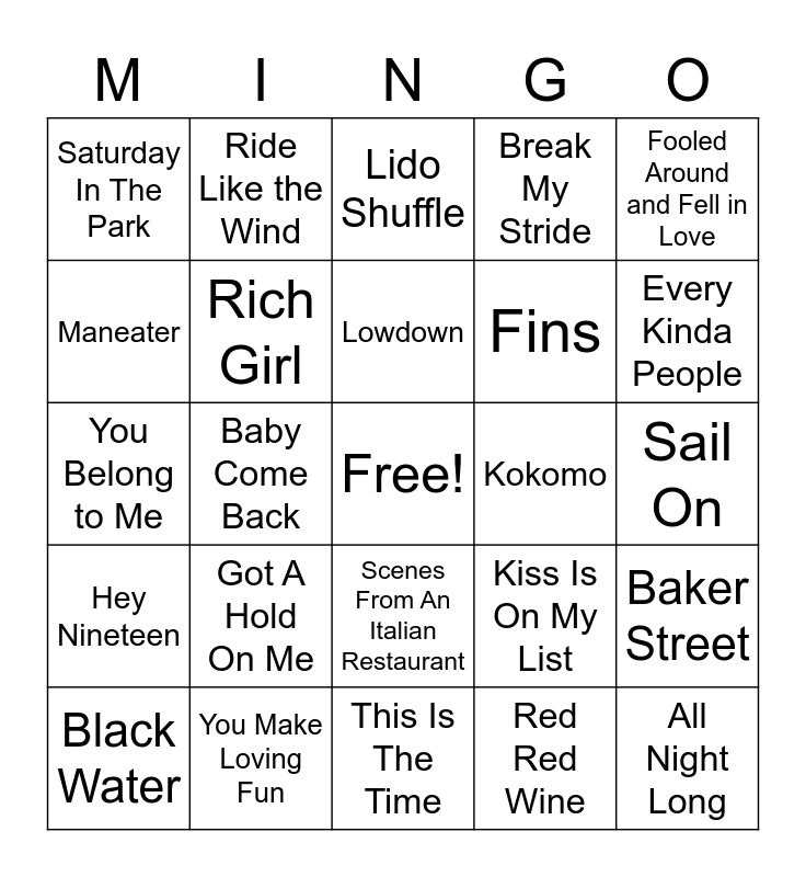 This bingo card has a free space and 32 words: Red Red Wine, Lonely Boy, Baby Come Back, I'd Really Love to See You Tonight, Hey Nineteen, Rich Girl, Fooled Around and Fell in Love, Baker Street, Ride Like the Wind, Summer Breeze, Lowdown, Lido Shuffle, Peg, What a Fool Believes, Kokomo, Careless Whisper, Black Water, You Belong to Me, Scenes From An Italian Restaurant, Got A Hold On Me, Kiss Is On My List, Smooth Operator, Sail On, You Make Loving Fun, All Night Long, Break My Stride, Fins, Maneater, Saturday In The Park, This Is The Time, Cheeseburger In Paradise and Every Kinda People.