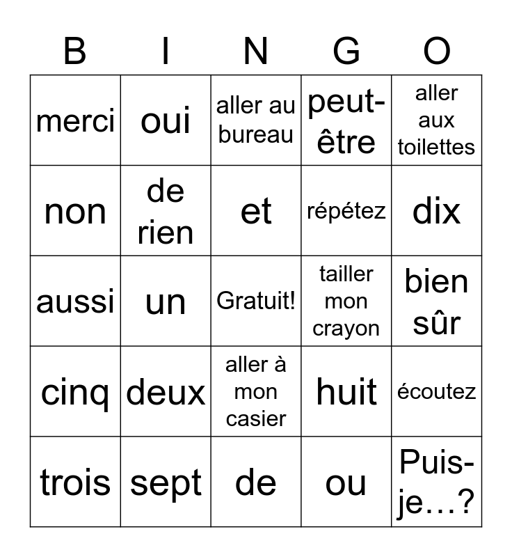 This bingo card has a free space and 24 words: deux, sept, et, trois, aller aux toilettes, merci, non, oui, tailler mon crayon, aller à mon casier, répétez, aussi, huit, écoutez, de rien, ou, bien sûr, aller au bureau, dix, un, Puis-je…?, cinq, peut-être and de.