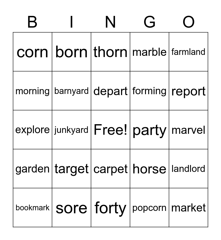 This bingo card has a free space and 39 words: artist, backyard, ballpark, barnyard, bookmark, carpet, depart, discard, farmland, garden, junkyard, marble, market, marvel, party, target, chore, corn, forth, horse, morning, forty, forming, report, more, store, storm, porch, transport, born, sport, stork, thorn, sore, popcorn, north, landlord, explore and boring.