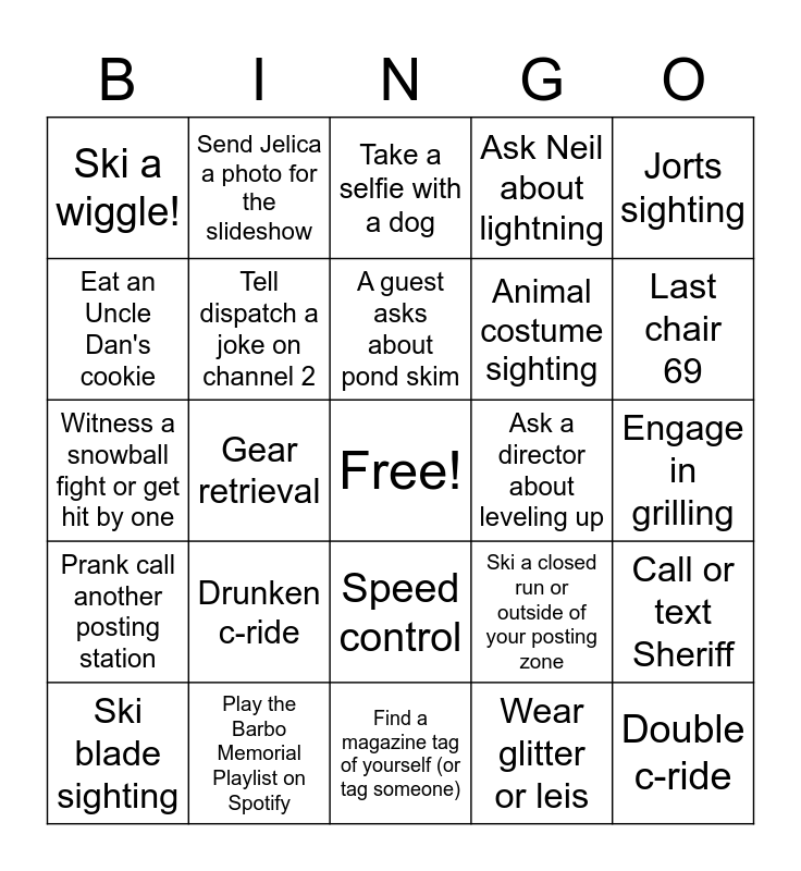 This bingo card has a free space and 24 words: Drunken c-ride, Play the Barbo Memorial Playlist on Spotify, A guest asks about pond skim, Ski blade sighting, Jorts sighting, Ski a wiggle!, Eat an Uncle Dan's cookie, Send Jelica a photo for the slideshow, Ask a director about leveling up, Speed control, Animal costume sighting, Witness a snowball fight or get hit by one, Ski a closed run or outside of your posting zone, Call or text Sheriff, Tell dispatch a joke on channel 2, Wear glitter or leis, Engage in grilling, Take a selfie with a dog, Last chair 69, Gear retrieval, Double c-ride, Prank call another posting station, Ask Neil about lightning and Find a magazine tag of yourself (or tag someone).